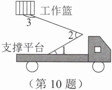 10. 如图是路政工程车的工作示意图,工作篮底部与支撑平台平行。若 $∠1 = 30^{\circ}$,$∠2 = 50^{\circ}$,则 $∠3$ 的度数为______