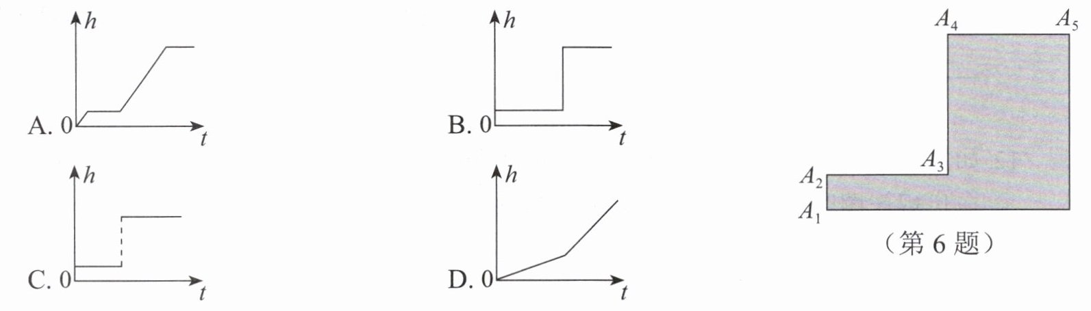 6. 蚂蚁搬家是自然界中有趣的现象。乐乐观察到,蚂蚁搬运食物时会沿台阶向上移动,蚂蚁要沿 $A_{1}→A_{2}→A_{3}→A_{4}→A_{5}$ 的路线行进搬运,若蚂蚁匀速前进,在这个过程中,蚂蚁所处的高度 $h$ 随时间 $t$ 变化的图像大致是(