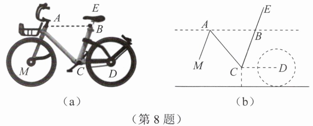 8. 深圳在滨海绿道旁设置了共享自行车点,邀市民于海风林荫间骑行,赏碧海蓝天,享诗意时光。图(a)是某款共享自行车的实物图,图(b)是其结构示意图。支架 $AB$ 和 $CD$ 与地面平行,$∠BCD = 70^{\circ}$,$∠BAC = 50^{\circ}$。当 $AM$ 平行于支撑杆 $BE$ 时,$∠MAC=$(