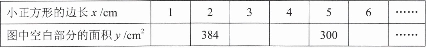 (2)剪去的小正方形的边长按整数值依次变化,即分别取1cm,2cm,3cm,4cm,5cm,6cm……时,图中空白部分的面积分别是多少?请你将计算的结果填入下表:
