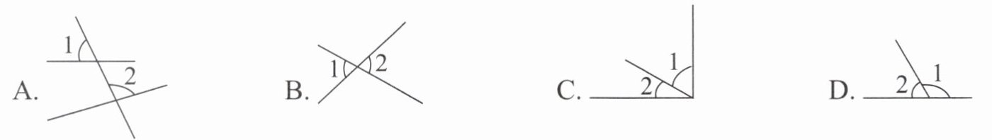 1. 下列各图中,$∠1与∠2$是对顶角的是(