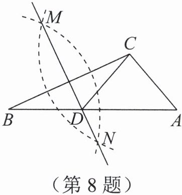8. 如图,在$△ABC$中,按以下步骤进行尺规作图:①分别以点$B$,$C$为圆心,以大于$\frac {1}{2}BC$的长为半径作弧,两弧相交于两点$M$,$N$;②作直线$MN交AB于点D$,连接$CD$。若$CD= AC$,$∠A= 50^{\circ }$,则$∠B$的度数为(