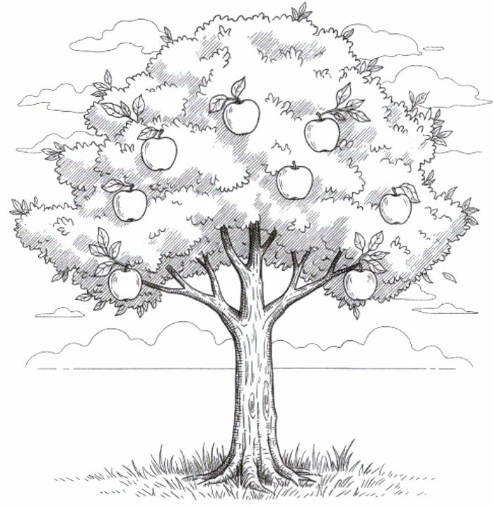 仔细观察这棵苹果树的简笔画,你能找到它的各个组成部分吗?请画出并用英语填写以下部位的名称:
