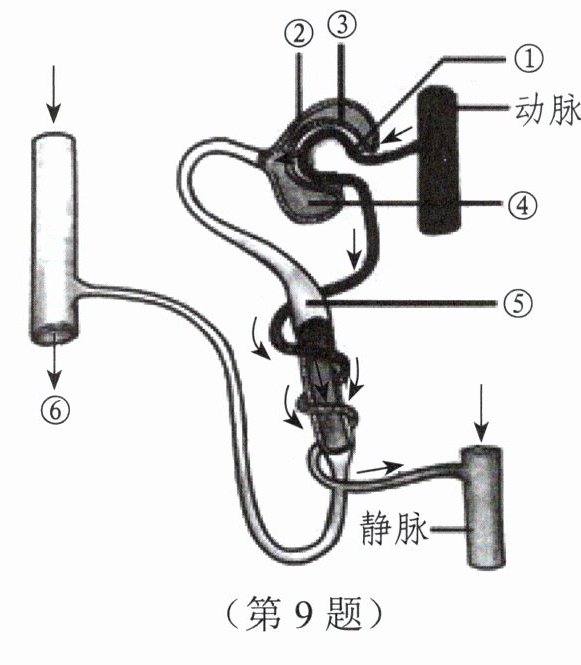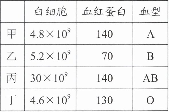 9. 血液、尿检是反映人体健康状况的“晴雨表”,下表为医生对甲、乙、丙、丁四名男生做体检时得到的血检结果统计【其中白细胞正常值为$(3.5-9.5)×10^{9}$个/升,血红蛋白正常值为115-150克/升】。右图则为肾单位结构示意图。请你据此分析回答: