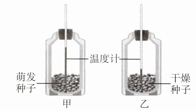 2. 种子萌发时呼吸作用旺盛。将等量萌发种子与干燥种子分别装入甲、乙两个保温瓶中,塞紧瓶塞,测得两保温瓶内温度相同。一段时间后,再次测量甲、乙两个保温瓶内的温度,结果如图所示。下列相关叙述错误的是(
