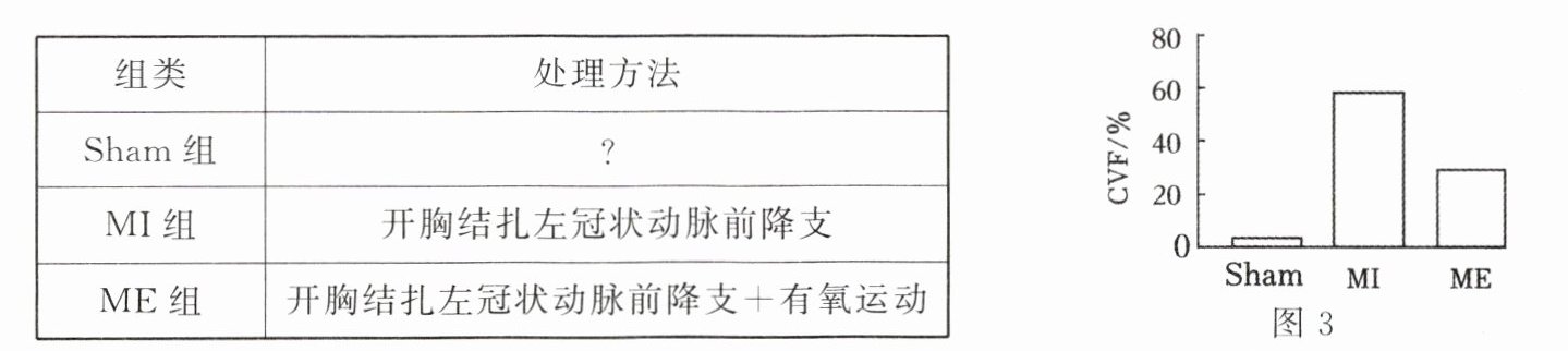 的血液供应,使其心肌细胞缺少氧气和养料,成为坏死的心肌。([ ]填图1中的字母,横线上填文字)(3)科研人员为探究有氧运动在改善心梗大鼠心脏结构与功能中的作用,在34只3月龄雄性大鼠中随机抽取10只,作为假手术组(Sham组),剩余24只结扎左冠状动脉前降支建立心梗组模型,共存活20只。随机分为心梗组(MI组)和心梗+有氧运动组(ME组),每组10只。ME组进行8周的有氧运动,具体操作见表。8周后,观察各组大鼠心脏形态结构,计算心肌胶原容积百分比CVF,结果如图3所示。