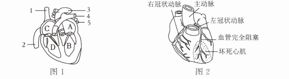 10. 图1是正常的心脏结构示意图,图2是心梗病人心脏结构示意图。左冠状动脉是主动脉的一个分支,“左前降支”是左冠状动脉的一个分支,左心室的血液供应有50%来自左前降支。左前降支一旦发生堵塞就容易引发心梗。请回答下列问题。
