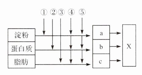 1. 如图表示人体消化吸收过程,①~⑤表示消化液(⑤为肠液)。纵向箭头表示消化液对相应物质的消化作用,a、b、c分别表示淀粉、蛋白质和脂肪的最终消化产物。下列有关分析错误的是(