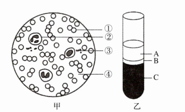 4. 血液是一种“流动的组织”,具有运输、防御、保护等重要功能。图甲是显微镜下人血涂片的视野,乙是血液的分层图,下列相关分析正确的是(