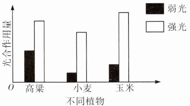 2. 兴趣小组的同学们在适宜的环境条件下,分别测定了强光和弱光下不同植物的光合作用量,结果如图所示。下列相关叙述正确的是(