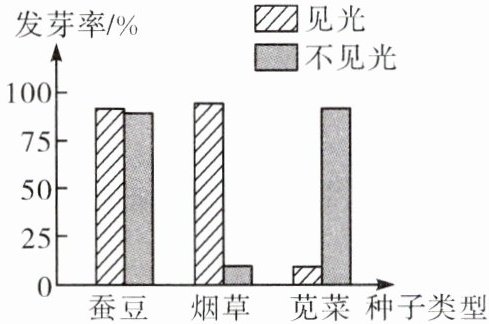 1. 研究人员在见光和不见光条件下分别测试了蚕豆、烟草和苋菜的种子发芽率,结果如图所示。下列判断错误的是(