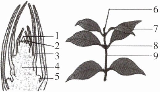 1. 如图是枝芽及其发育成的枝条结构示意图,图中1~9代表相应结构。下列说法错误的是(