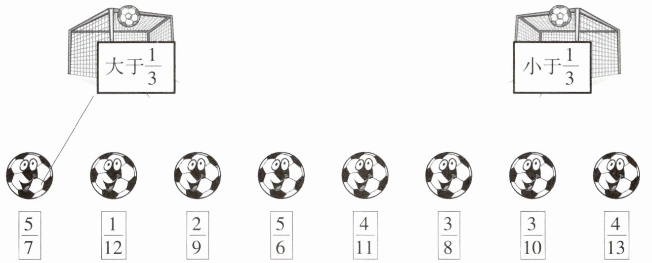 大于$\frac{1}{3}$:$\frac{5}{6}$,$\frac{4}{11}$,$\frac{3}{8}$ 小于$\frac{1}{3}$:$\frac{1}{12}$,$\frac{2}{9}$,$\frac{3}{10}$,$\frac{4}{13}$