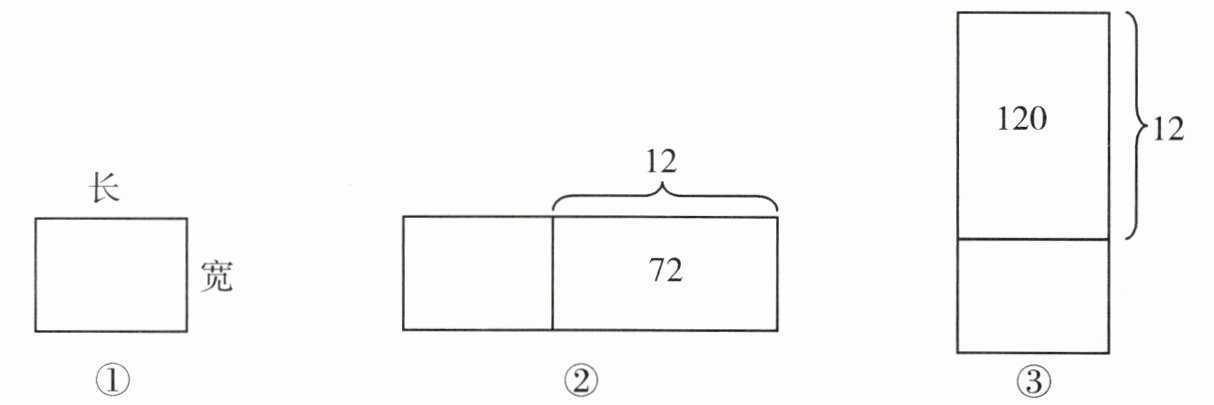 根据条件把第一个因数增加12,则长方形的长延长12,第二个因数不变即宽不变(如图②);同样第一个因数不变即长不变,第二个因数增加12,则宽延长12(如图③)。