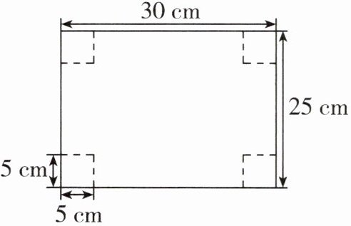 12. 一个长方形铁皮长 30 cm,宽 25 cm,从四个角各切掉一个边长为 5 cm 的正方形,做成一个无盖盒子,这个盒子用了多少平方厘米的铁皮?它的容积是多少?