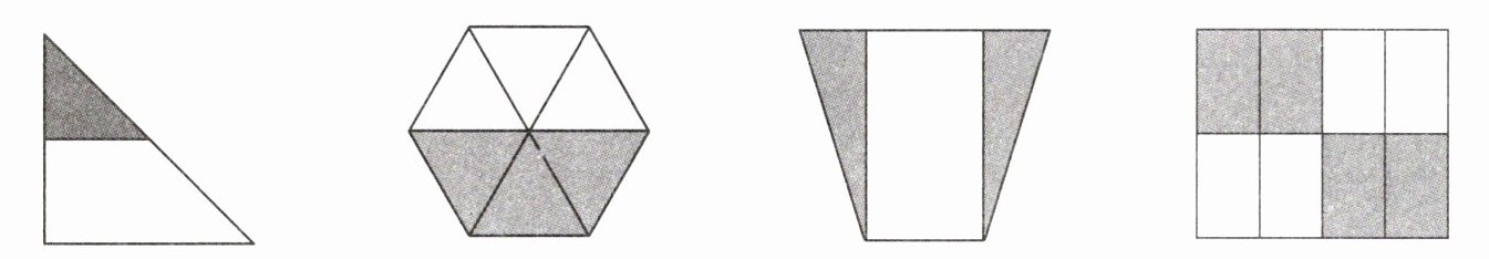 4. 把下面每个图形都看作单位“1”,用下列分数表示各图中阴影部分的大小,对吗?(正确的画“√”,错误的画“×”)