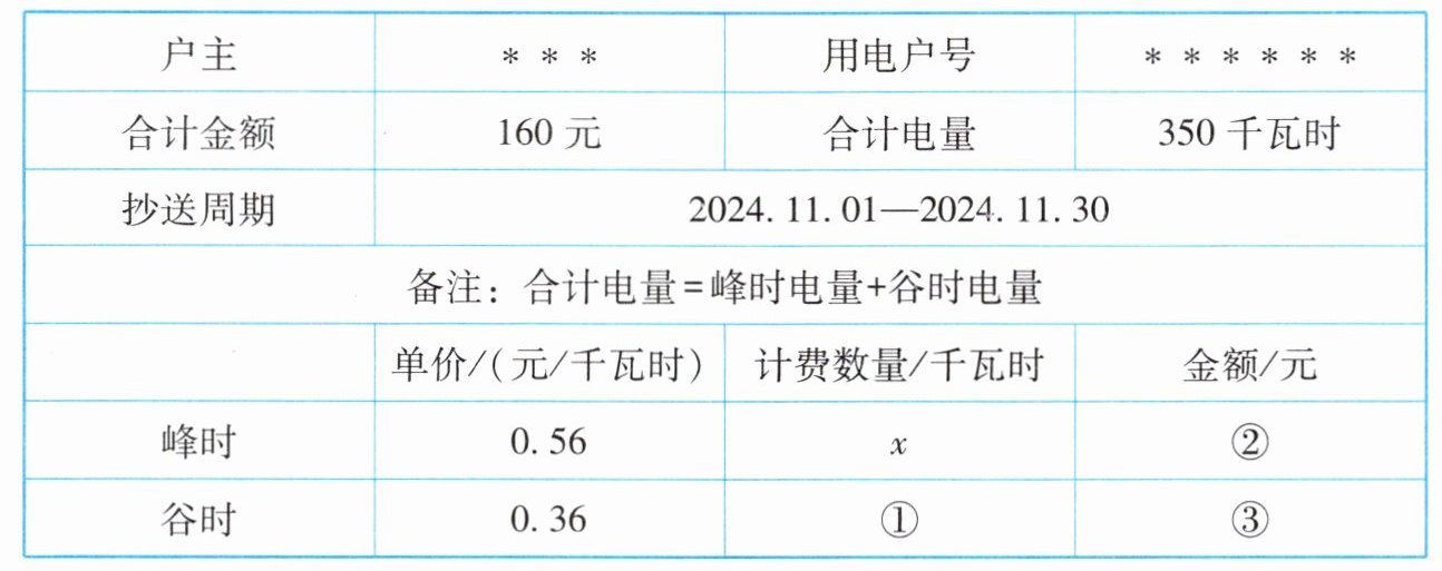 (3)该账单中的峰时电量为 $170$ 千瓦时,谷时电量 $180$ 千瓦时.
