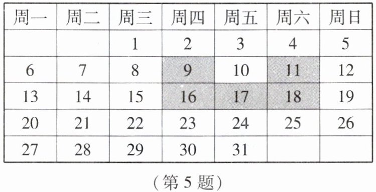 5. 如图是2025年1月的月历表,用“U”形框框中5个数(如阴影部分所示),移动“U”形框,当框中的五个数的和是126时,则框中的五个数中,最小的数是()