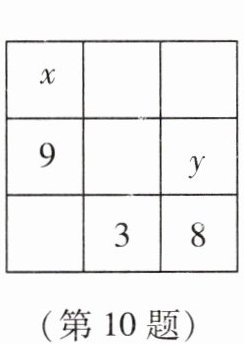 10.(传统文化)幻方,最早源于我国,古人称之为纵横图. 在如图所示的幻方中,各行、各列及各条对角线上的三个数字之和均相等,则$x + y$的值为______.