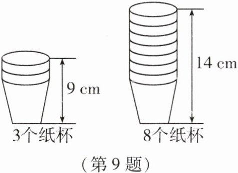 9. 小明在超市帮妈妈买回一袋纸杯,他把纸杯整齐地叠放在一起,如图所示,请你根据图中的信息,若小明把50个纸杯整齐叠放在一起时,它的高度约是______cm.