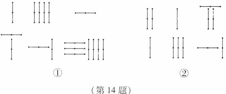 14.(传统文化)我国古代数学著作《九章算术》的“方程”一章里,一次方程组是由算筹布置而成的. 如图①,图中各行从左到右列出的算筹数分别表示未知数x、y的系数与相应的常数项,把图①所示的算筹图用我们现在所熟悉的方程组的形式表述出来,就是$\begin{cases}x + 4y = 10,\\6x + 11y = 34\end{cases} $请你根据图②所示的算筹图,列出方程组,并求解.