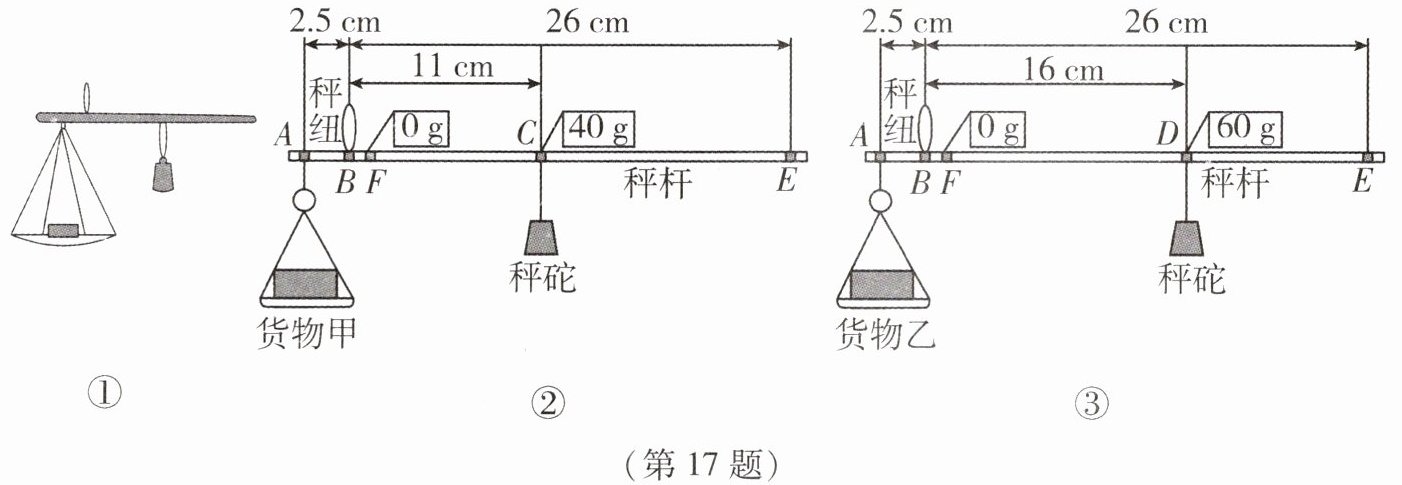17.(传统文化)杆秤是我国度量衡“三大件(尺斗秤)”的重要组成部分,是中华民族衡重的基本量具. 杆秤依据杠杆原理制作而成,一般由秤钩(秤盘)、秤杆和秤砣三部分组成,秤杆上的刻度叫做“秤星”,古时候秤杆叫做“权”,秤砣叫做“衡”,“权衡”一词就来源于此.