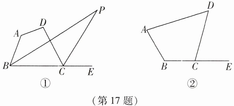 17. 如图,在四边形ABCD中,设$\angle A= \alpha$,$\angle D= \beta$,$\angle P$为四边形ABCD的内角$\angle ABC与外角\angle DCE$的平分线所在直线相交而形成的锐角.