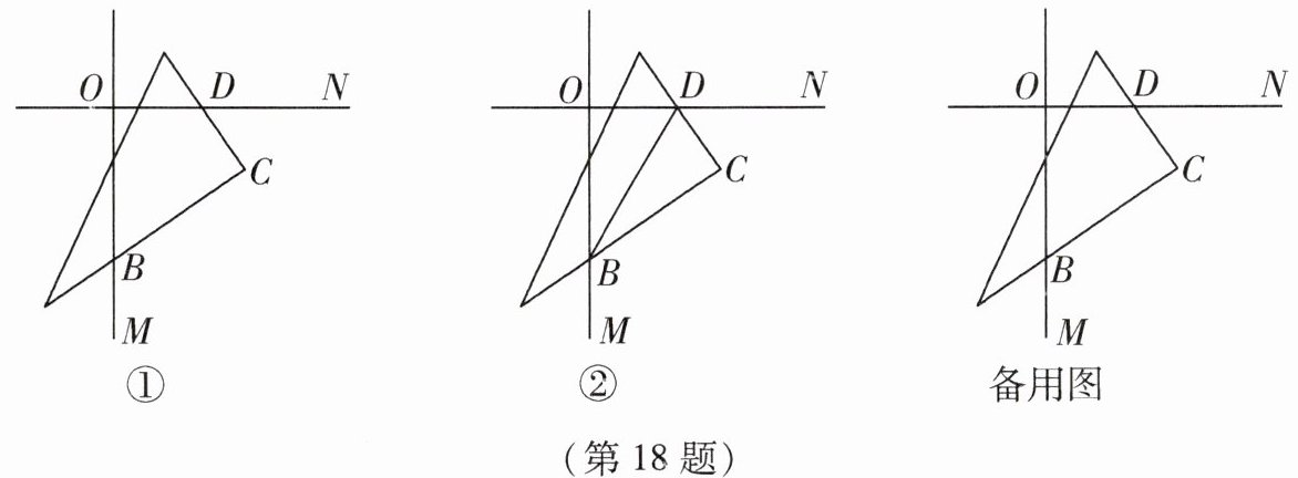 (3)小雪说:“若DE平分$\angle ODC$、BF平分$\angle MBC$,我发现DE与BF具有特殊的位置关系.”请你先在备用图中补全图形,再判断DE与BF有怎样的位置关系并说明理由.