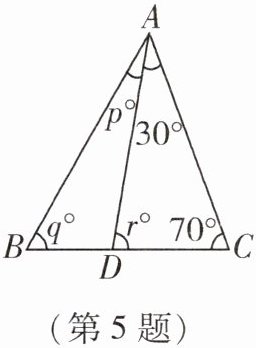 5. 如图,在 $ \triangle ABC $ 中,点 $ D $ 在 $ BC $ 上. 根据图中标示的度数,则 $ p + q + r $ 之值为()