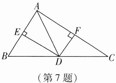 7. 如图,在 $ \triangle ABC $ 中, $ AD $ 为中线, $ DE $ 和 $ DF $ 分别为 $ \triangle ADB $ 和 $ \triangle ADC $ 的高,若 $ AB = 6 $, $ AC = 8 $, $ DF = 3 $,则 $ DE = $____.