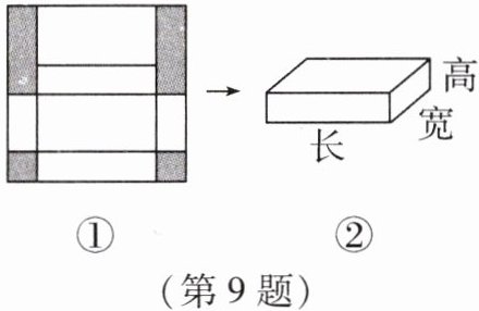 9. 图①是边长为30cm的正方形纸板,裁掉阴影部分后将其折叠成如图②所示的长方体盒子,已知该长方体的宽是高的2倍,这个长方体的高为______cm.