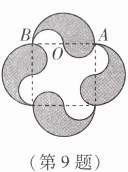 9. 如图为某公园中心对称的观赏鱼池,阴影部分为观赏喂鱼台,已知OA= OB= 2m.则阴影部分的面积为$____m^2. ($结果保留π)