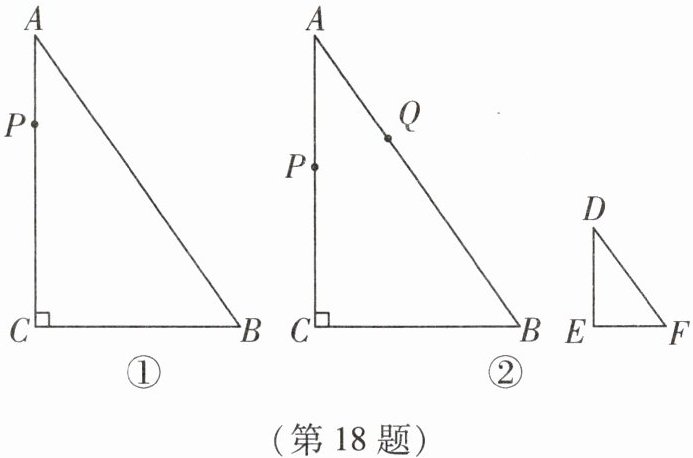 (2)如图②,在$\triangle DEF$中,$\angle E = 90^{\circ}$,$DE = 4\ \text{cm}$,$DF = 5\ \text{cm}$,$\angle D = \angle A$. 在$\triangle ABC$的边上,若另外有一个动点$Q$,与点$P同时从点A$出发,沿着边$AB \to BC \to CA$运动,回到点$A$停止. 在两点运动过程中的某一时刻,恰好$\triangle APQ \cong \triangle DEF$,求点$Q$的运动速度.