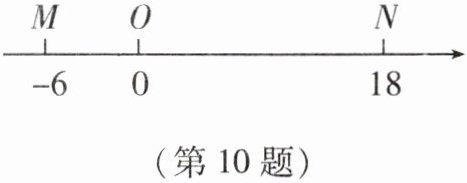 10. 如图,数轴上三点 $ M $、$ O $、$ N $ 对应的数分别为 -6、0、18,$ P $ 为数轴上一动点. 如果点 $ P $ 以每分钟 2 个单位长度的速度从点 $ O $ 向左运动,同时点 $ M $ 和点 $ N $ 分别以每分钟 3 个单位长度和每分钟 4 个单位长度的速度也向左运动. 若 $ t $ 分钟时点 $ P $ 到点 $ M $、$ N $ 的距离相等,则 $ t $ 的值为______.