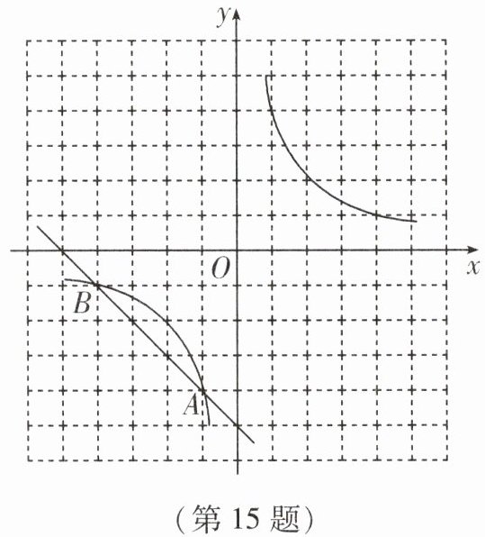 15. 如图,在平面直角坐标系中,双曲线 $y= \frac{k}{x}$ 与直线 $y = ax + b$ 的交点 $A$、$B$ 均在小正方形的顶点上,每个小正方形的边长均为 $1$.