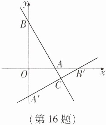 16. 如图,在平面直角坐标系中,直线 $y = -2x + 4$ 分别交 $x$ 轴、$y$ 轴于点 $A$、$B$,将 $\triangle AOB$ 绕点 $O$ 顺时针旋转 $90^{\circ}$ 后得到 $\triangle A'OB'$.