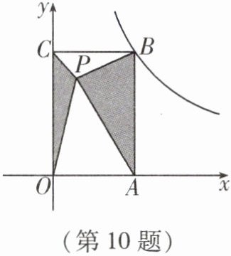 10. 如图,在平面直角坐标系中,矩形$OABC的顶点A$、$C分别在x$轴、$y$轴的正半轴上,顶点$B在函数y = \frac{6}{x}(x > 0)$的图象上。$P是矩形OABC$内的一点,连结$PO$、$PA$、$PB$、$PC$,则图中阴影部分的面积是______。