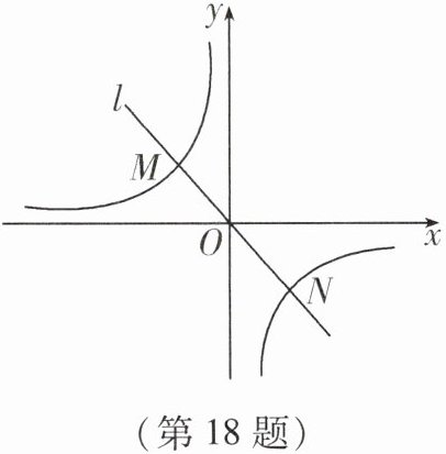 18. 如图,过原点的直线 $ l $ 与反比例函数 $ y= -\frac{1}{x} $ 的图象交于 $ M $,$ N $ 两点,根据图象猜想线段 $ MN $ 的长度的最小值.