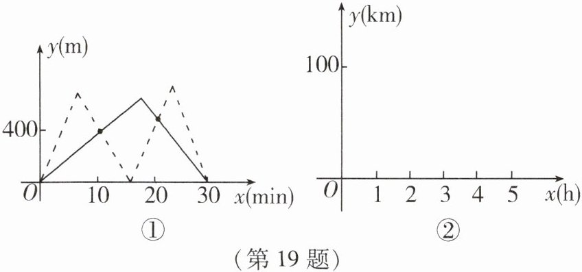 “父亲和儿子同时出去晨练. 如图①,实线表示父亲离家的距离 $ y(m) $ 与时间 $ x(min) $ 的函数关系;虚线表示儿子离家的距离 $ y(m) $ 与时间 $ x(min) $ 的函数关系. 由图象可知,他们在出发 $ 10 min $ 时第一次相遇,此时离家 $ 400 m $;晨练了 $ 30 min $,他们同时到家. ”