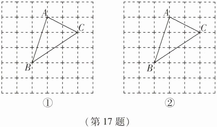 17. 图①、图②均是 $6 × 6$ 的正方形网格,每个小正方形的顶点称为格点,小正方形的边长为 $1$,$\triangle ABC$ 的顶点 $A$、$B$、$C$ 均在格点上。仅用无刻度的直尺在给定的网格中按要求画图,只保留作图痕迹,不要求写出画法。