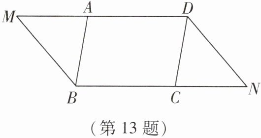13. 如图,在四边形$ABCD$中,$AD// BC$,$AB + AD = CD + CB$. 延长$DA至点M$,使$AM = AB$,延长$BC至点N$,使$CN = CD$,连结$BM$、$DN$.