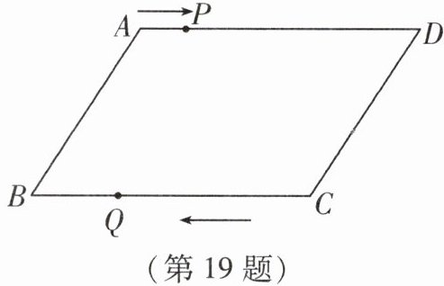 19. 如图,在$□ ABCD$中,已知$AD = 15\mathrm{cm}$,点$P在AD上以1\mathrm{cm/s}的速度从点A向点D$运动,点$Q在BC上以4\mathrm{cm/s}的速度从点C$出发往返运动,两点同时出发,当点$P到达点D$时停止运动(同时点$Q$也停止),设运动时间为$t(\mathrm{s})(t > 0)$.