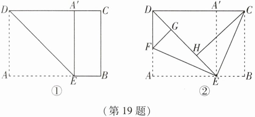 19. 如图①,将矩形ABCD沿DE折叠,使顶点A落在DC上的点A'处,然后将矩形展平,沿EF折叠,使顶点A落在折痕DE上的点G处. 再将矩形ABCD沿CE折叠,此时顶点B恰好落在DE上的点H处,如图②.