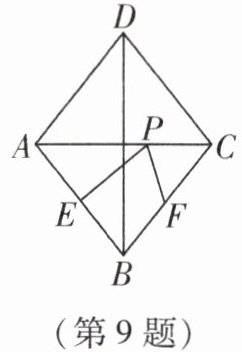 9. 如图,在菱形 $ABCD$ 中,$E$、$F$ 分别为 $AB$、$BC$ 的中点,$P$ 为 $AC$ 上任意一点,$AC = 6$,$BD = 8$,则 $PE + PF$ 的最小值为____cm.