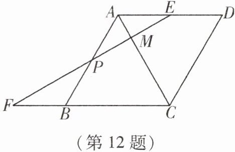 12. 如图,在菱形 $ABCD$ 中,$E$ 是 $AD$ 的中点,$EF\perp AC$ 交 $CB$ 的延长线于点 $F$,分别交 $AC$、$AB$ 于点 $M$、$P$. 求证:$AB$ 与 $EF$ 互相平分.