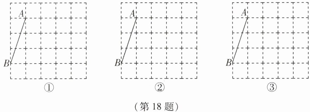 18. 图①、图②、图③均是 $5× 5$ 的正方形网格,每个小正方形的顶点称为格点,小正方形的边长为 $1$,点 $A$、$B$ 均在格点上. 按下列要求画图,所画图形的顶点均在格点上且不全等,不要求写画法.