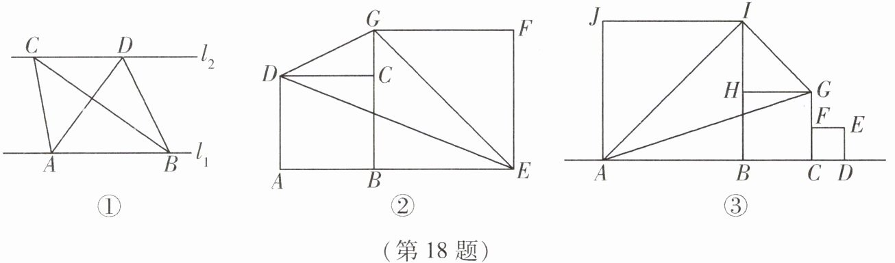 18. 探究:如图①,直线$l_1//l_2,$点A、B在直线$l_1$上,点C、D在直线$l_2$上. 记△ABC的面积为$S_1,△ABD$的面积为$S_2. $求证:$S_1= S_2.$