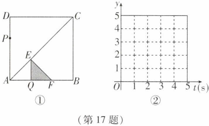 17. 如图,在正方形ABCD中,AB= 4,点P从点A出发,沿A—D—A以每秒2个单位长度的速度向终点A运动,同时点Q从点A出发,沿A—B以每秒1个单位长度的速度向终点B运动. 过点Q作EQ⊥AB交AC于点E,以点Q为直角顶点,EQ为直角边向右作等腰直角三角形QFE. 设运动时间为t(s),△QEF与正方形ABCD重叠部分的面积为S(平方单位).