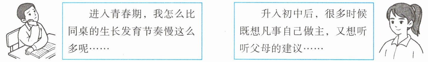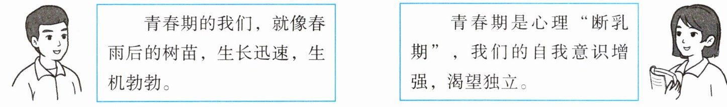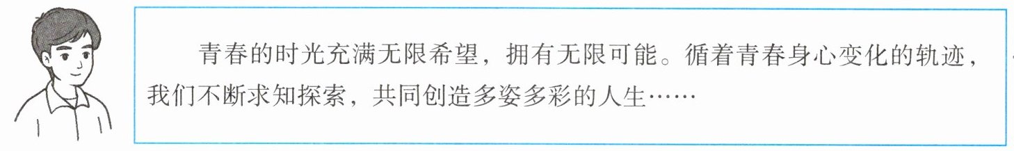 (2)生理变化让我们感受到旺盛的生命力,让我们的身体充满能量。我们精力充沛、思维敏捷,对成长充满渴望。心理上的变化让我们感到新奇,也让我们产生困惑。