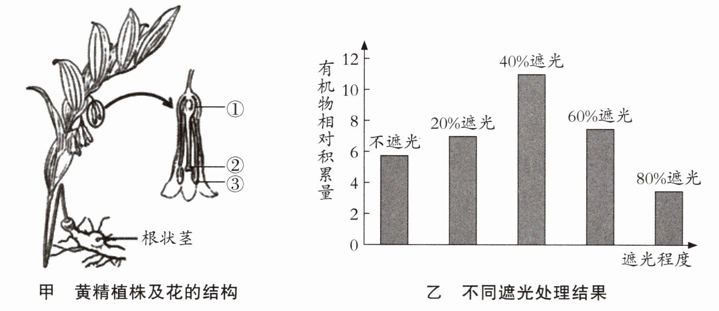 10. 中药黄精是黄精植株的根状茎,具有提高免疫力、降血糖血脂和消炎等功效。黄精怕强光照射,人工栽培时适当遮光利于有机物积累,提高产量。